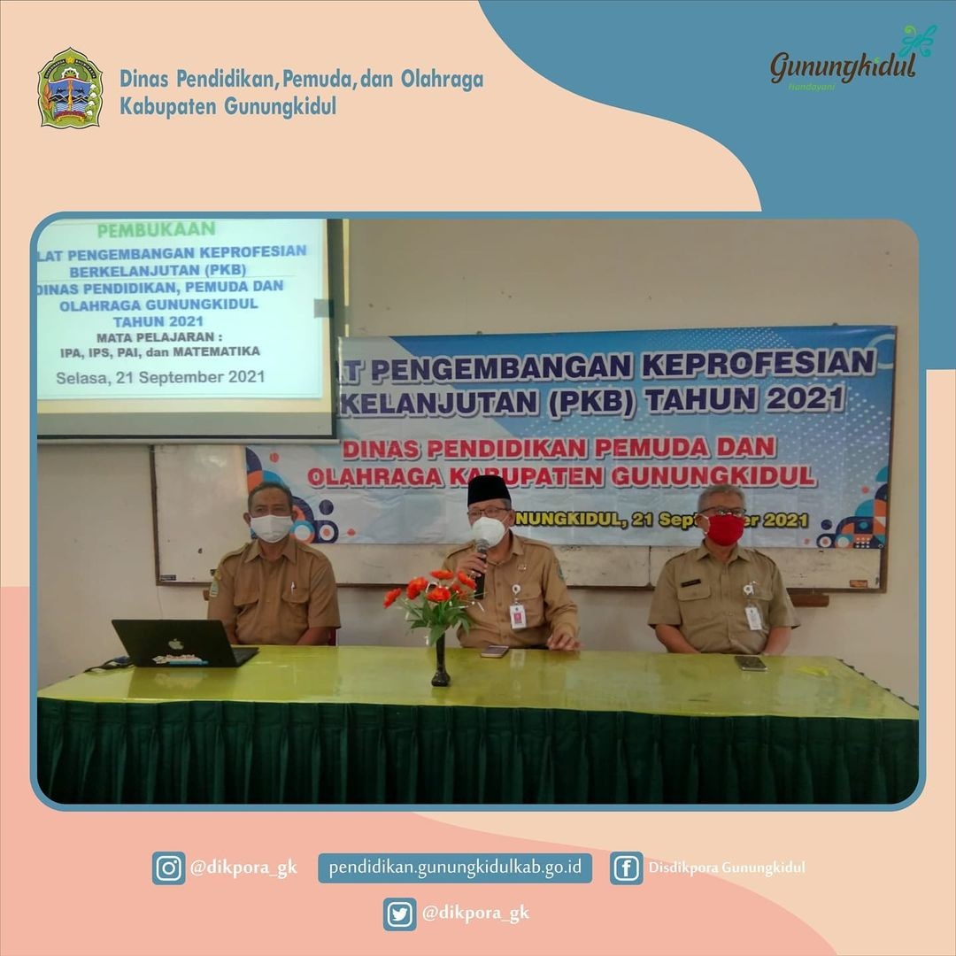 WONOSARI- Drs. Ali Ridho, M.M. selaku Pelaksana Tugas (PLT) Kepala Dinas Pendidikan, Pemuda, dan Olahraga (Disdikpora) Kabupaten Gunungkidul membuka kegiatan Diklat Pengembangan Keprofesian Berkelanjutan (PKB) Tahun 2021. Bertempat di Sekolah Menegah Pertama (SMP) Negeri Wonosari 1 Diklat PKB diikuti oleh Guru IPA, IPS, PAI, dan Matematika jenjang SMP di Kabupaten Gunungkidul. Tujuan diadakannya diklat PKB ialah untuk meningkatkan kualitas guru-guru jenjang SMP di Kabupaten Gunungkidul.